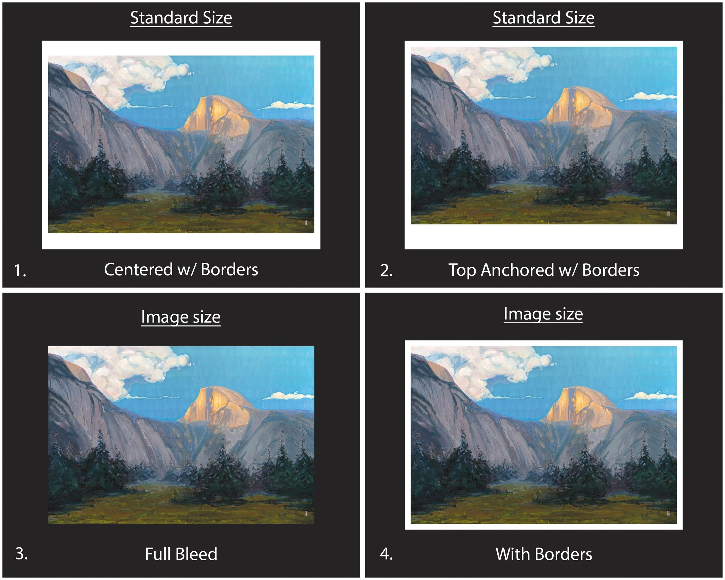 3. Image Size - Full Bleed: No borders. Your image will be scaled to fit within the size you select for purchase. Then cropped to the images edge. Final print size can vary depending on your image dimensions.